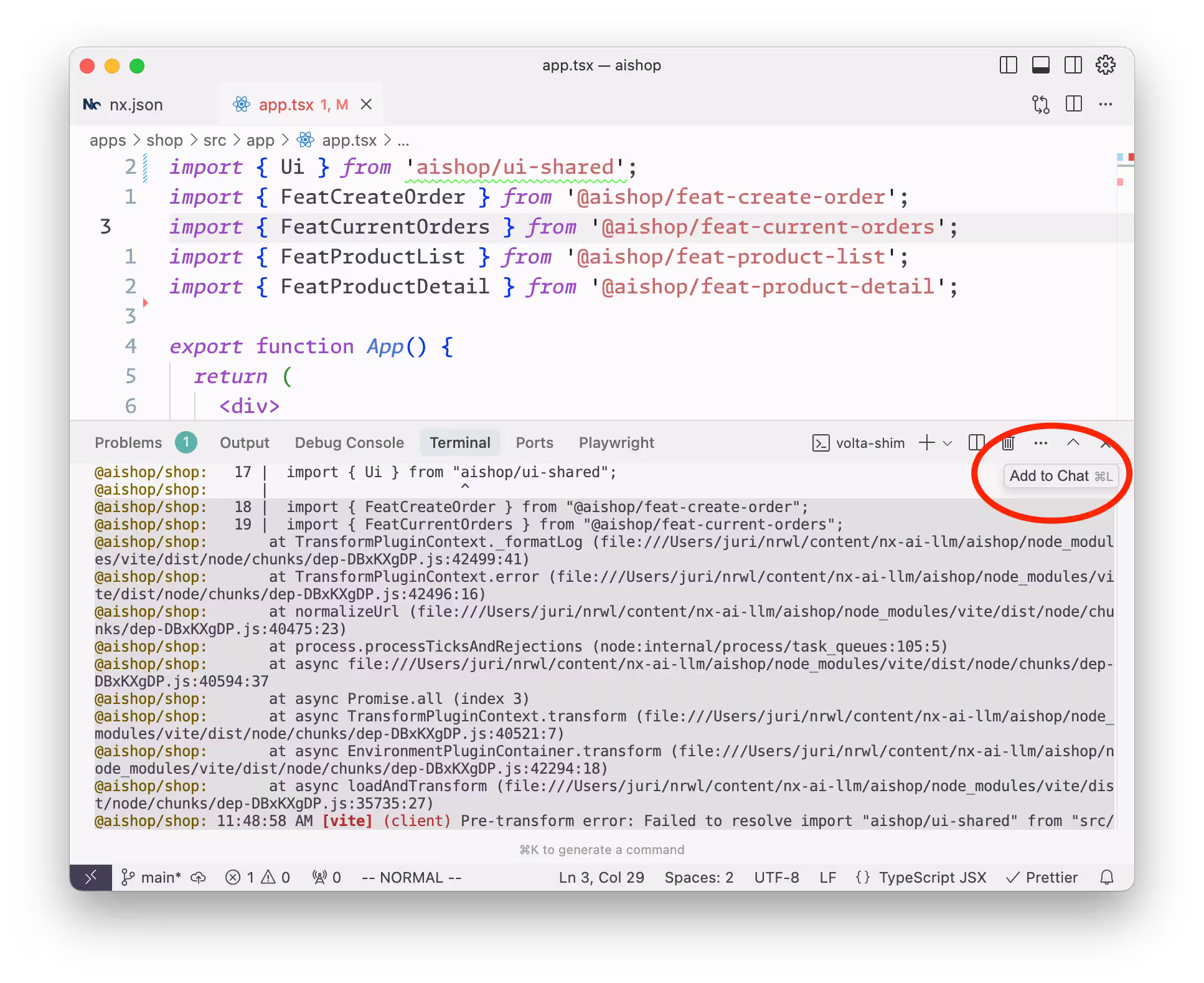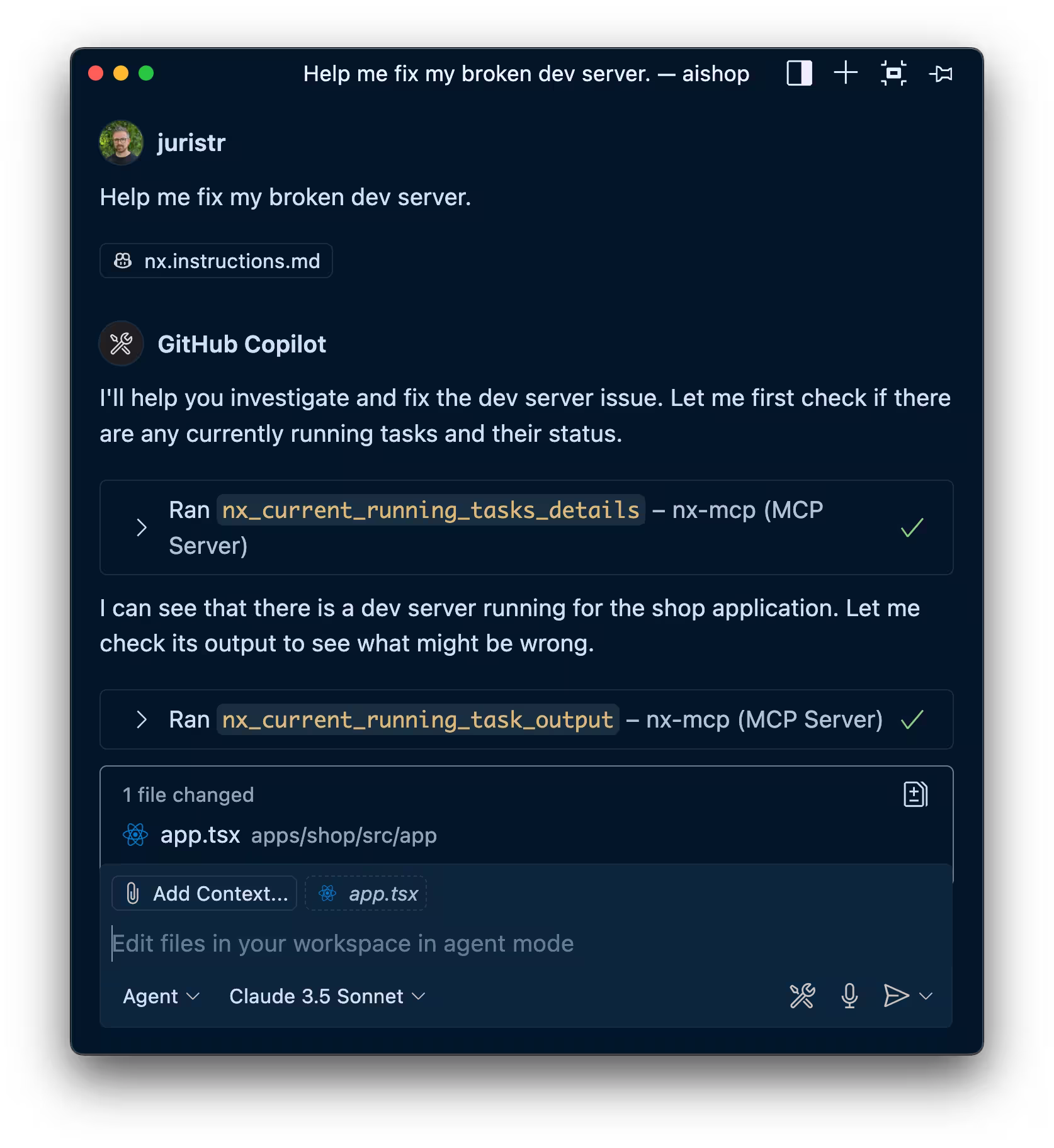 Not anymore. We've just shipped an integration that allows your AI assistant to access your Nx terminal, the tasks that are currently running as well as their output. This opens up a whole new interaction workflow where you don't have to provide context: the LLM "would just know" about it. Let's dive in.